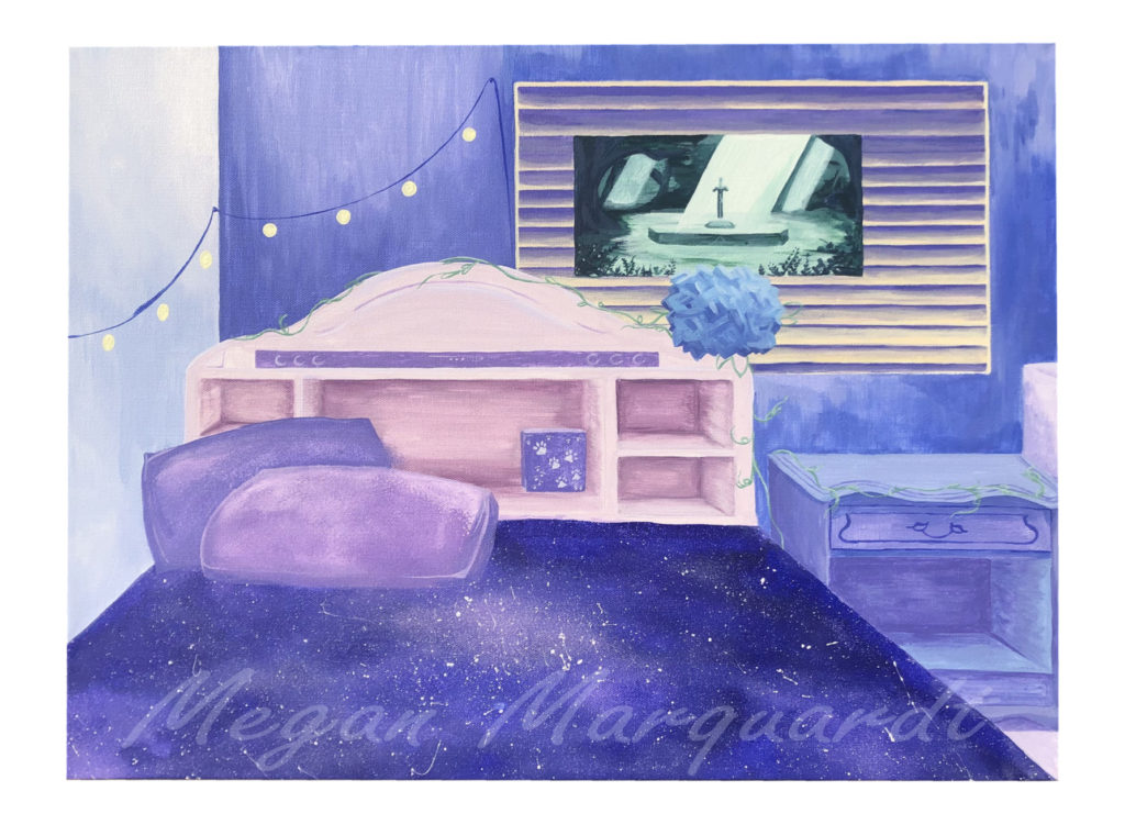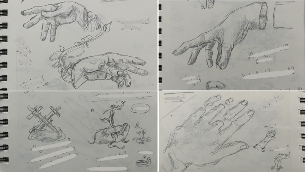 A few of my works I made in Spring 2021, ranging from acrylic paint on canvas, pencil sketches for a 3D project, and a watercolor exercise (where I made random splotches of color and then turn it into a picture).